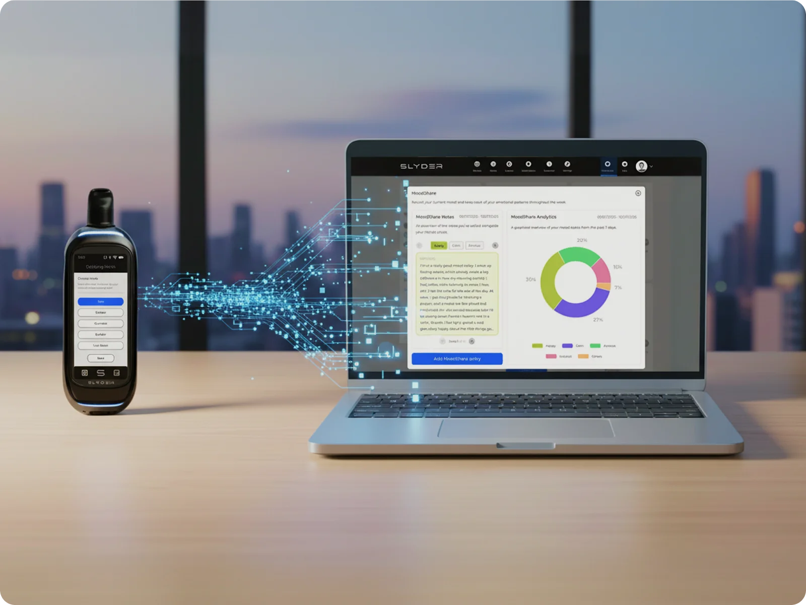 SLYDER Pro connects over Wi-Fi and Bluetooth, syncing settings, session history, and stats to the web dashboard and mobile app. Your preferences stay on the device.