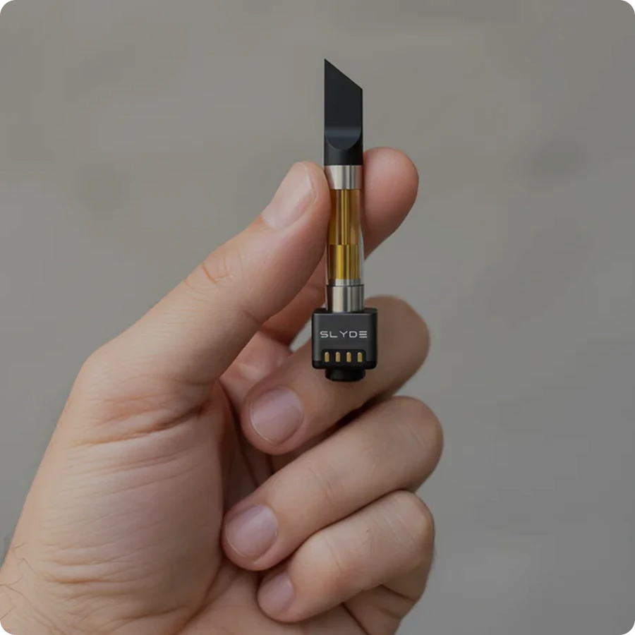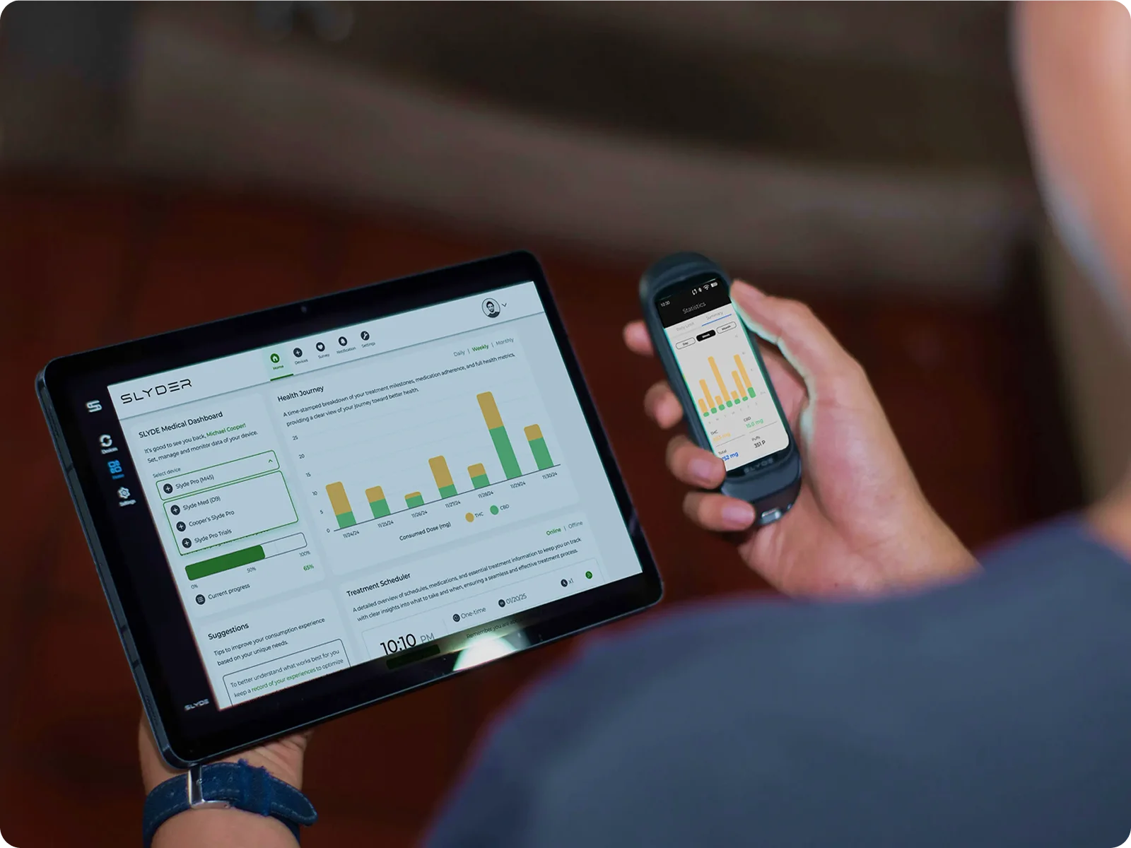 The mobile app gives you the same controls on your phone. Scan a pod or cartridge to pull product and compound information directly from the source. Review your data, adjust session settings, and dial things in before you start. Both platforms stay in sync through your SLYDER Pro account.